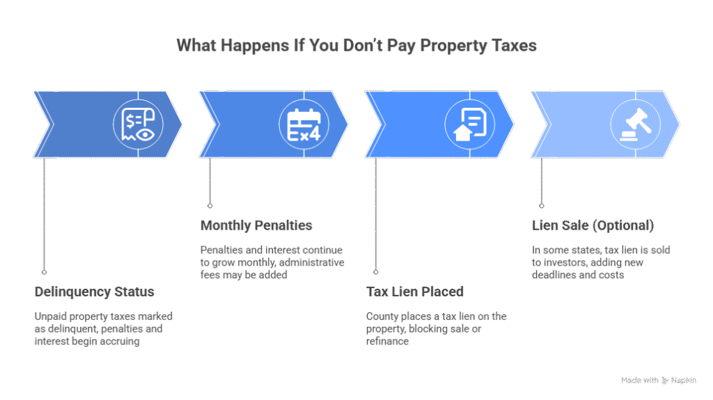 If you don’t pay property taxes, the county adds penalties, marks your account as delinquent, and can place a tax lien on your property. If the balance is unpaid, the process may move toward a tax sale or foreclosure, depending on your state.